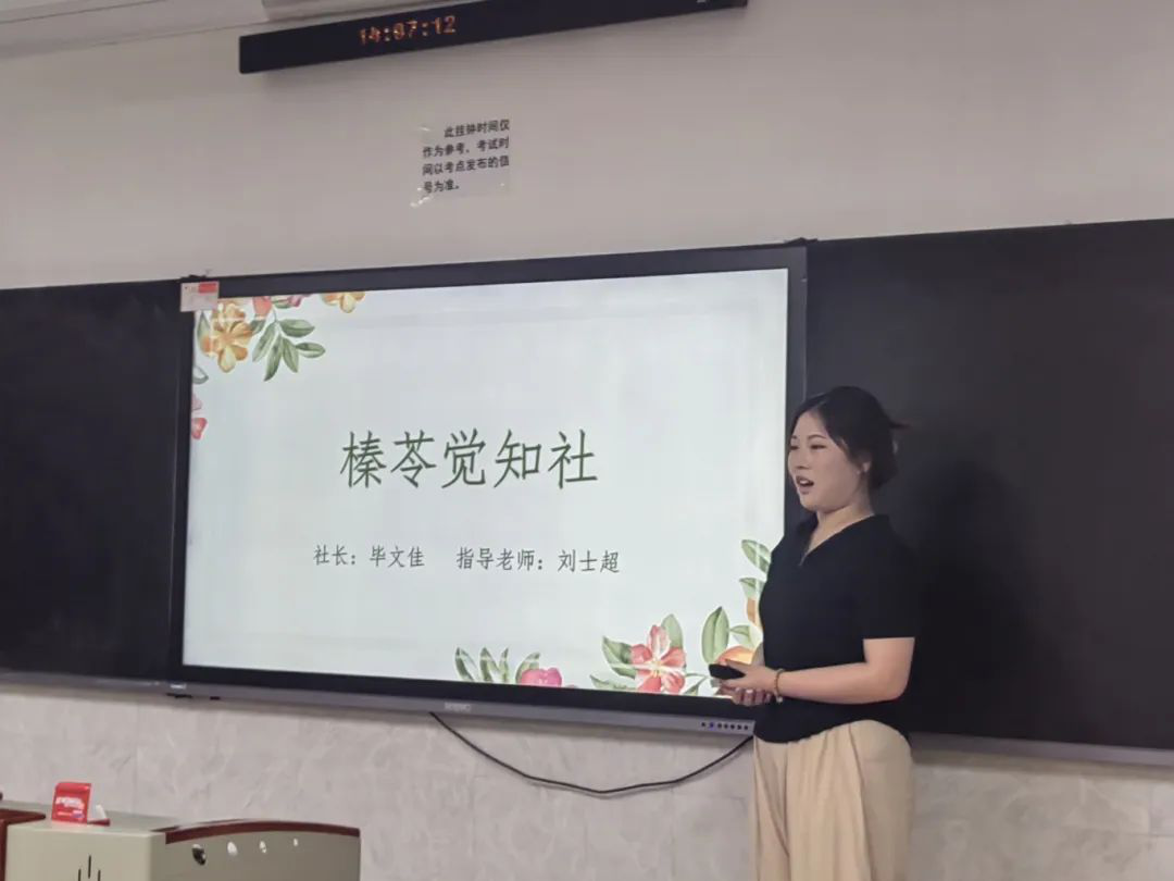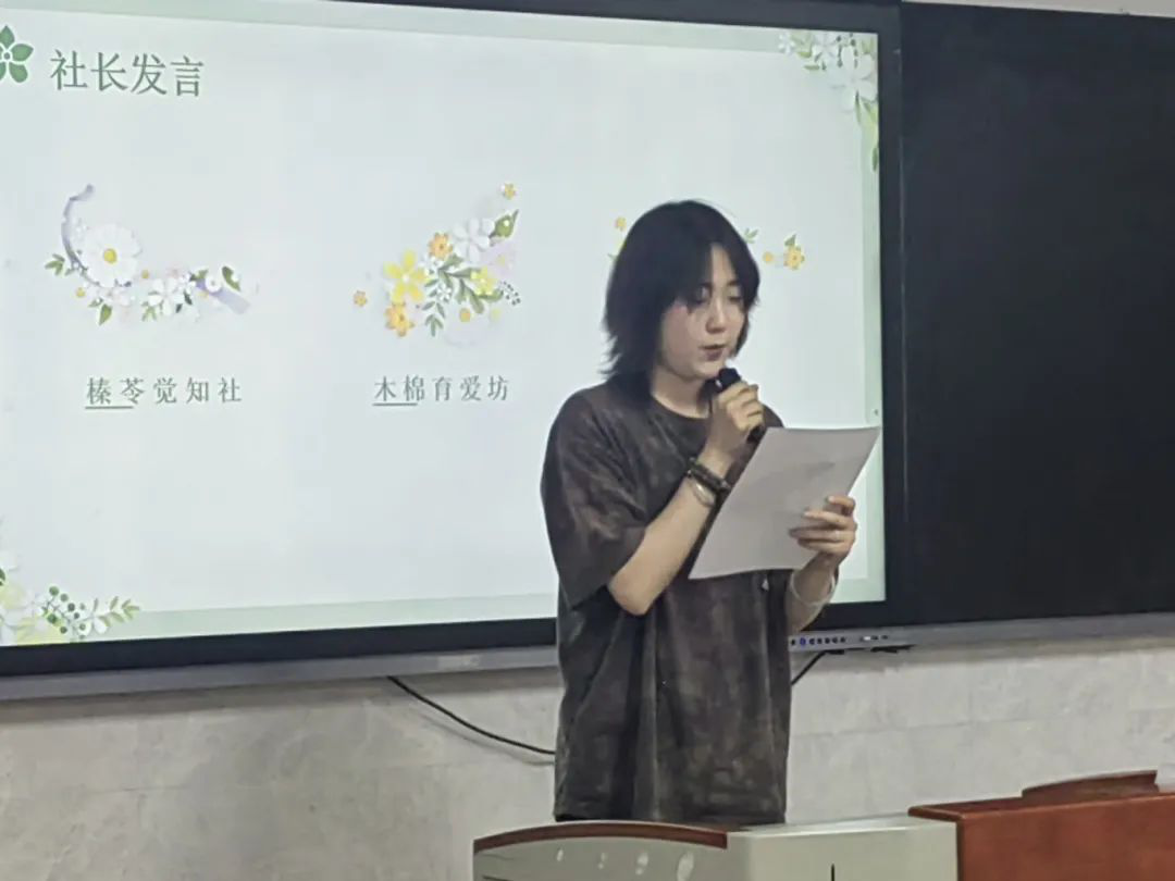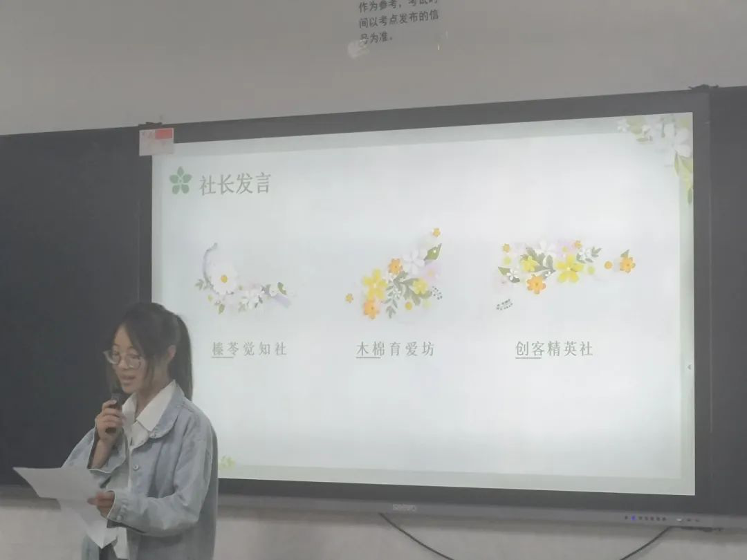 三位社团负责人分别对自己和所负责的社团工作进行介绍。榛苓觉知社社长毕文佳计划依托传统节日开展创意性、互动性与教育性并存的特色活动。木棉育爱坊社长郑晶晶(巩芳菲代理发言)计划开展家庭教育主题讲座、家庭话剧表演以及家庭教育微电影拍摄等活动。创客精英社社长薛岩娟计划举办创意设计比赛、邀请行业专家、企业HR或成功创业者分享经验、为学生组织针对性的培训课程等活动。