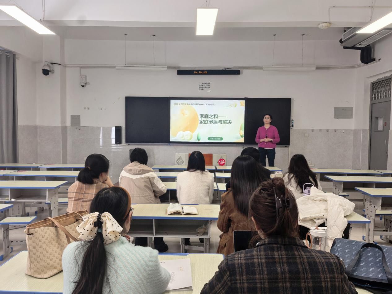 过程中,贺潇老师以“家庭之和”模块课程为主题,以有关亲子沟通矛盾的公益短片为切入点,从家庭矛盾的认知重构、家庭矛盾的类型及形成原因、非暴力沟通方法训练以及冲突应对的四种姿态等四个方面,系统阐释了课程内容,引导学生逐步掌握家庭矛盾的理解与化解能力。