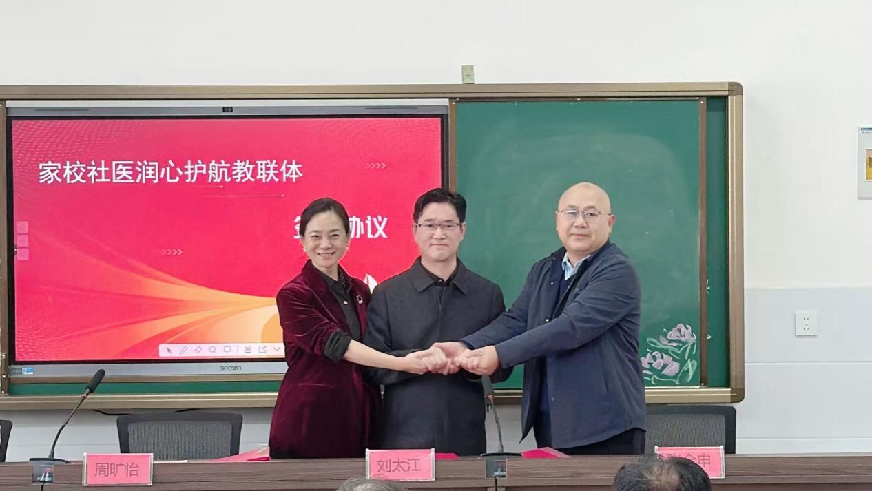 随后,三方代表共同签署协议,并共同为“家校社医协同育人教联体”揭牌。